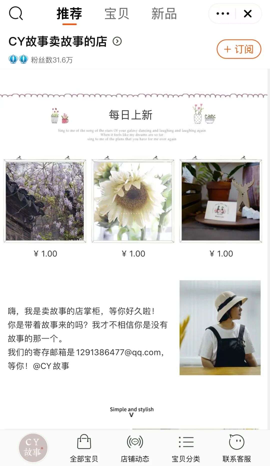 CY故事店开了9年。这里的故事不需要购买,全部都展示在商品详情页中,如果顾客觉得被故事触动,可以自愿花1元钱拍下它。